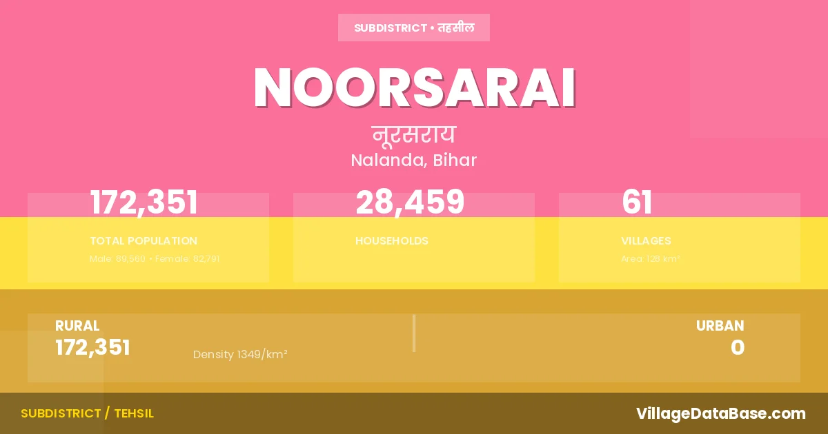 According to the 2011 census The total area of Noorsarai Subdivision is 128 km², with a population of 172351 people. The population density is 1,349 inhabitants per square kilometre, and there are approximately 28459 houses in the sub district.