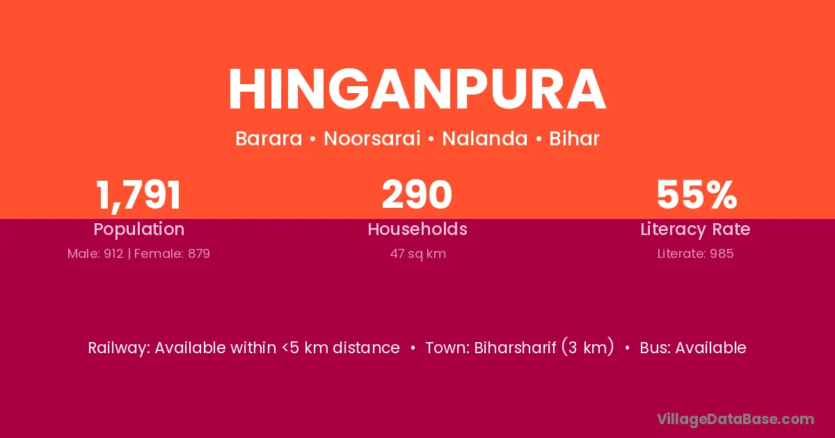 Biharsharif (3 km) is the nearest town to Hinganpura village for major economic activities and is located approximately 3 km away.