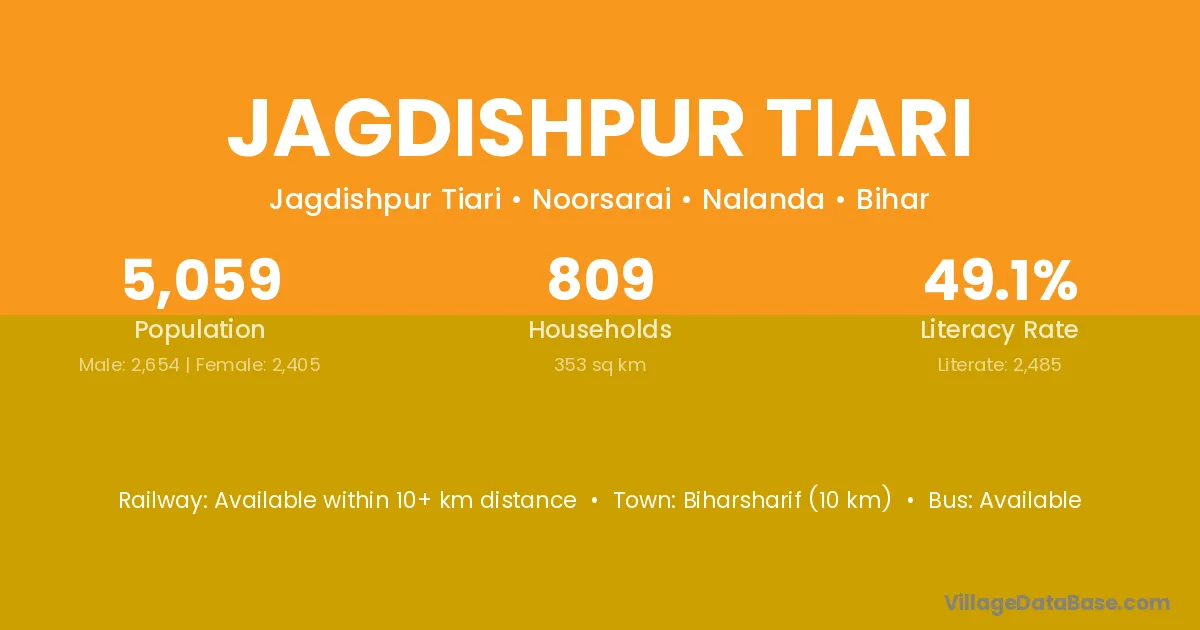 Biharsharif (10 km) is the nearest town to Jagdishpur Tiari village for major economic activities and is located approximately 10 km away.