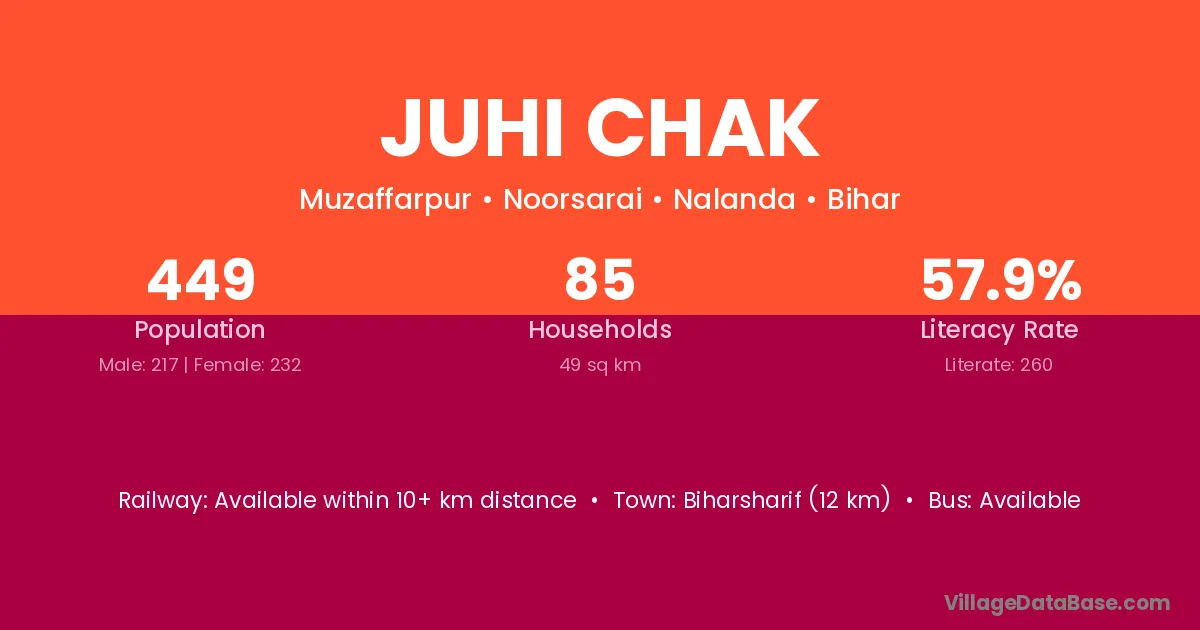 Biharsharif (12 km) is the nearest town to Juhi Chak village for major economic activities and is located approximately 12 km away.