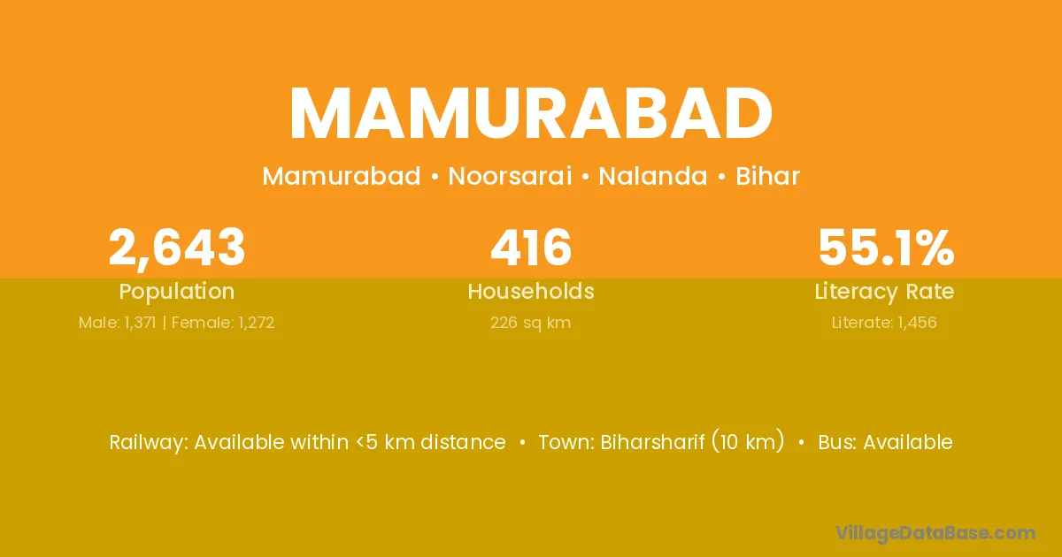 Biharsharif (10 km) is the nearest town to Mamurabad village for major economic activities and is located approximately 10 km away.