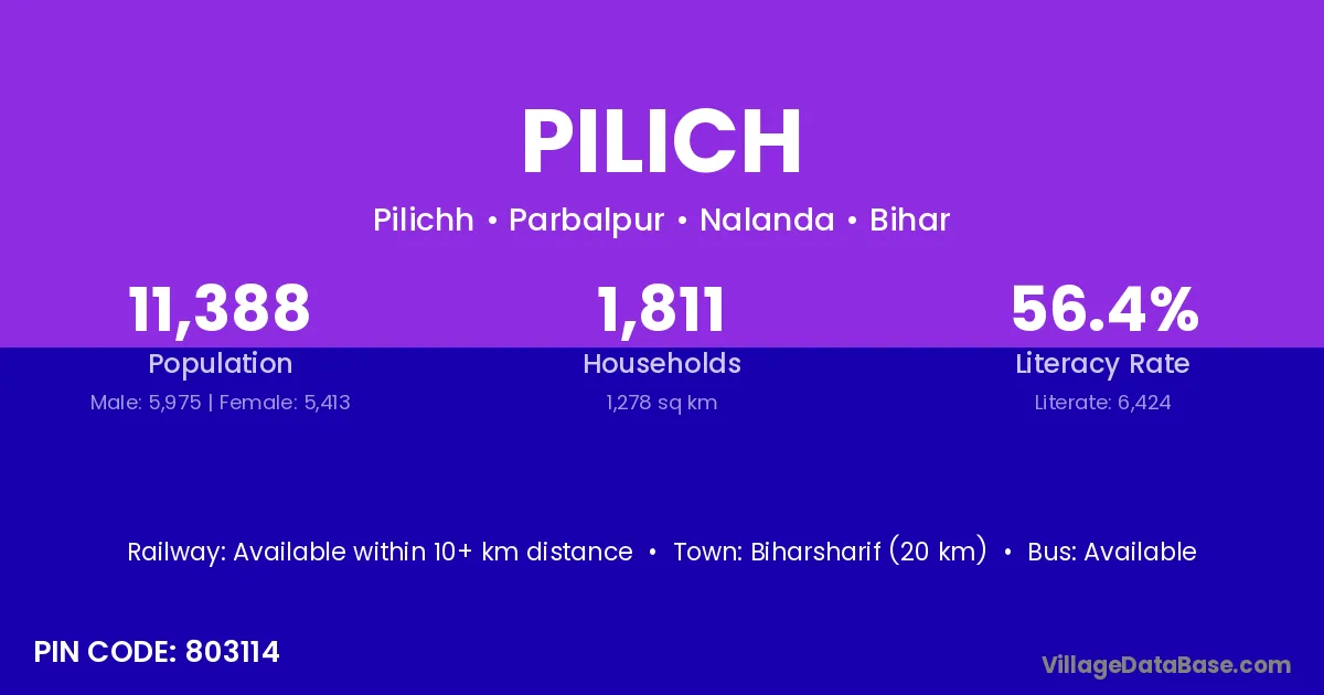 Biharsharif (20 km) is the nearest town to Pilich village for major economic activities and is located approximately 20 km away.