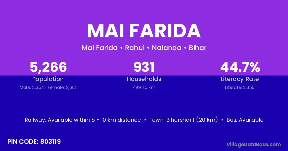 Biharsharif (20 km) is the nearest town to Mai Farida village for major economic activities and is located approximately 20 km away.