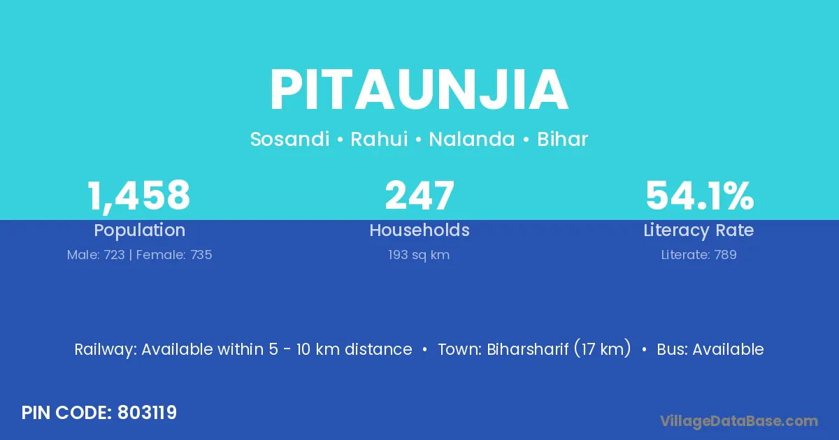 Biharsharif (17 km) is the nearest town to Pitaunjia village for major economic activities and is located approximately 17 km away.