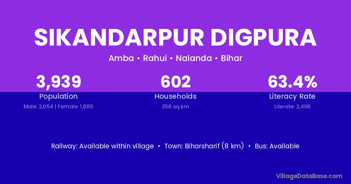 Biharsharif (8 km) is the nearest town to Sikandarpur Digpura village for major economic activities and is located approximately 8 km away.