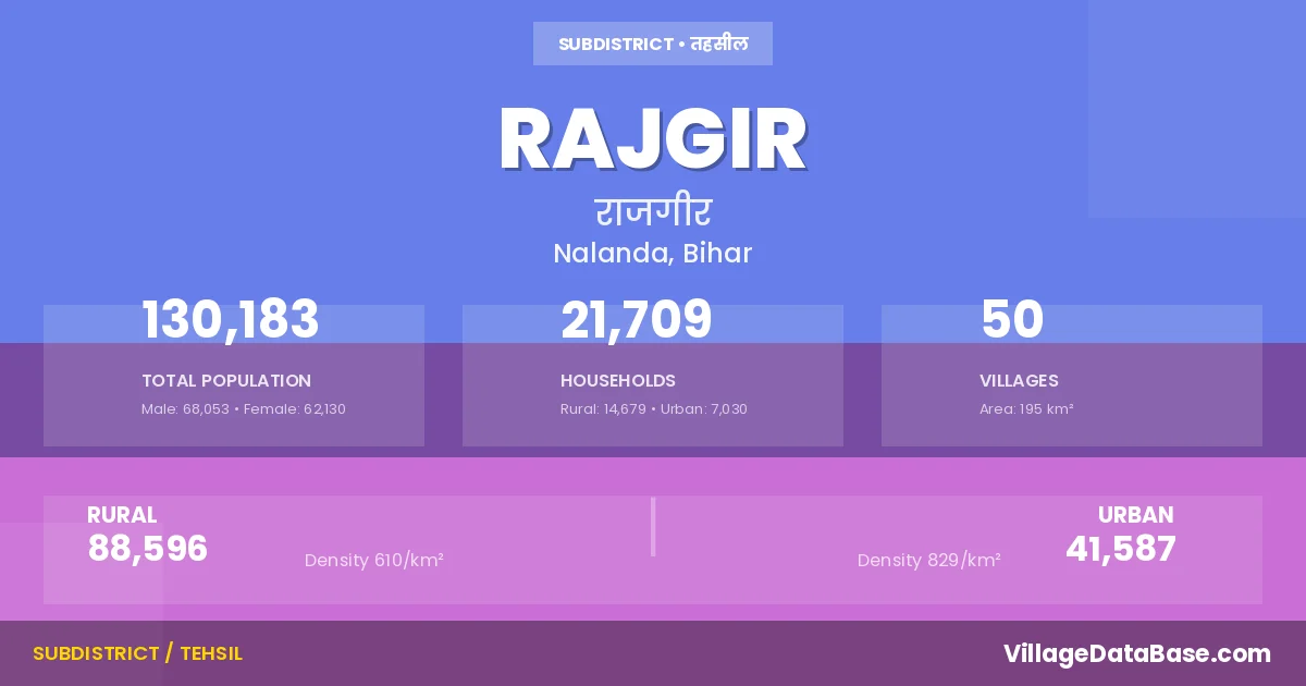 According to the 2011 census The total area of Rajgir Subdivision is 195 km², with a population of 130183 people. The population density is 666 inhabitants per square kilometre, and there are approximately 21709 houses in the sub district.