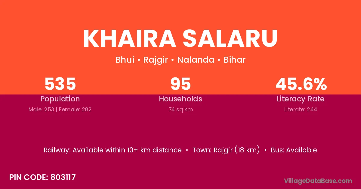 Rajgir (18 km) is the nearest town to Khaira Salaru village for major economic activities and is located approximately 18 km away.