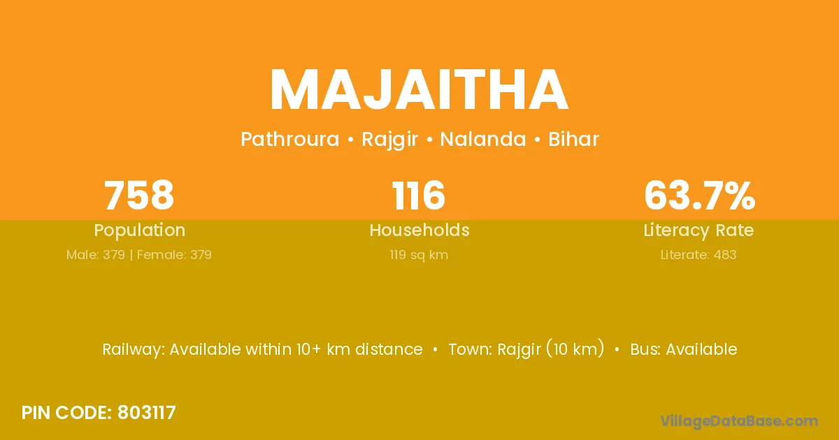 Rajgir (10 km) is the nearest town to Majaitha village for major economic activities and is located approximately 10 km away.