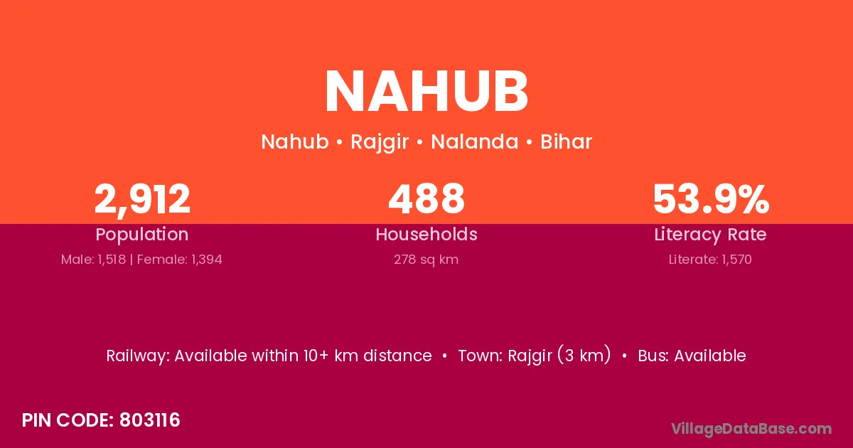 Rajgir (3 km) is the nearest town to Nahub village for major economic activities and is located approximately 3 km away.