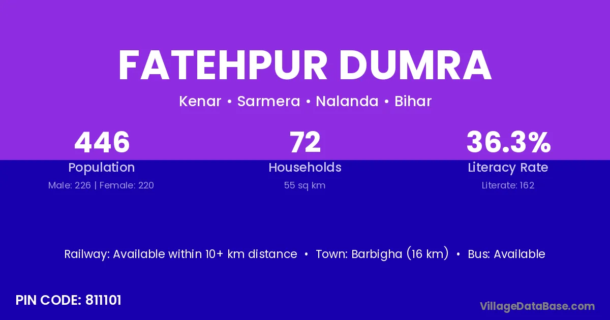 Barbigha (16 km) is the nearest town to Fatehpur Dumra village for major economic activities and is located approximately 16 km away.