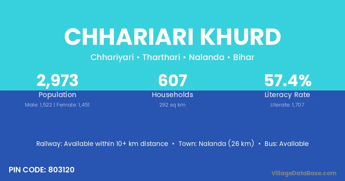 Nalanda (26 km) is the nearest town to Chhariari Khurd village for major economic activities and is located approximately 26 km away.