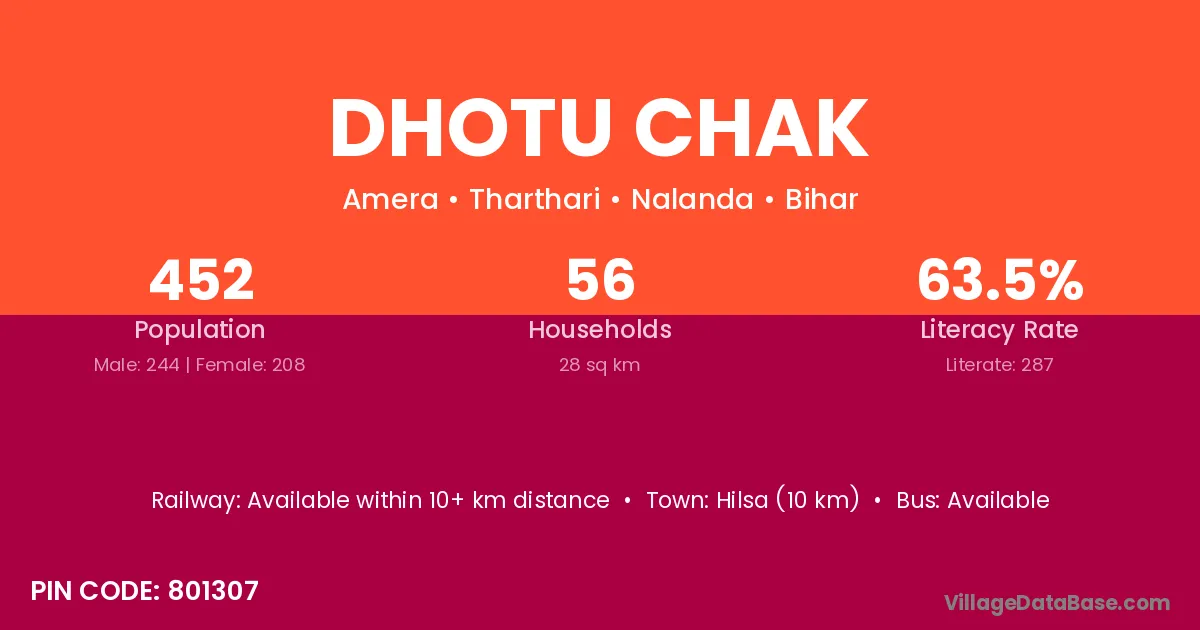 Hilsa (10 km) is the nearest town to Dhotu Chak village for major economic activities and is located approximately 10 km away.