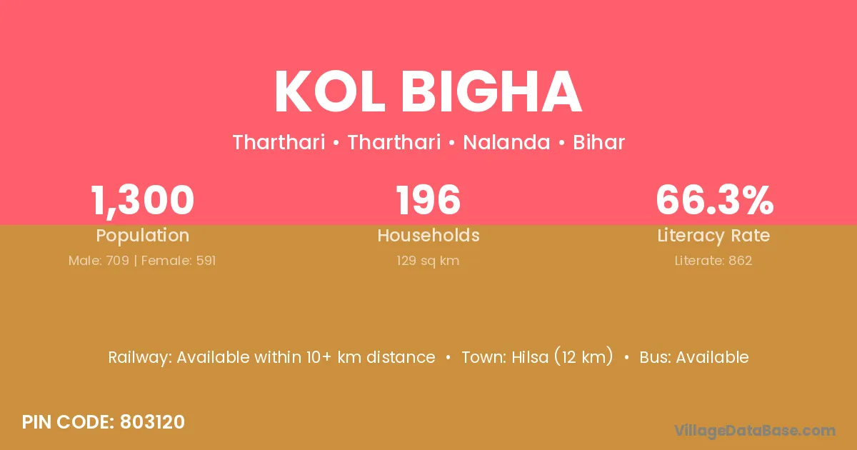 Hilsa (12 km) is the nearest town to Kol Bigha village for major economic activities and is located approximately 12 km away.