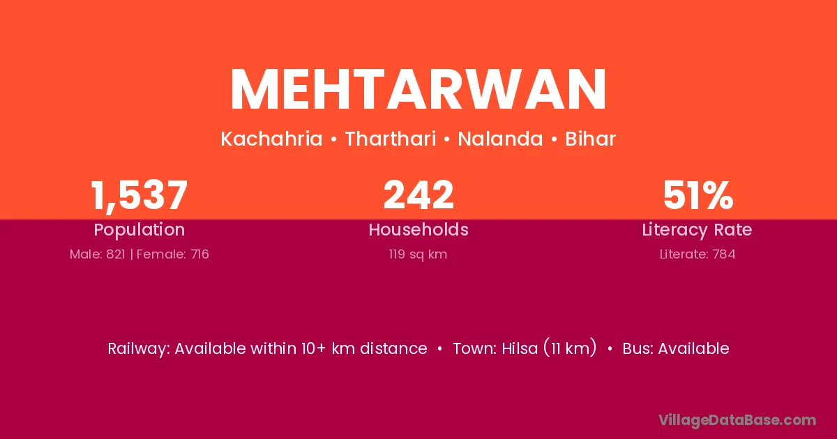 Hilsa (11 km) is the nearest town to Mehtarwan village for major economic activities and is located approximately 11 km away.