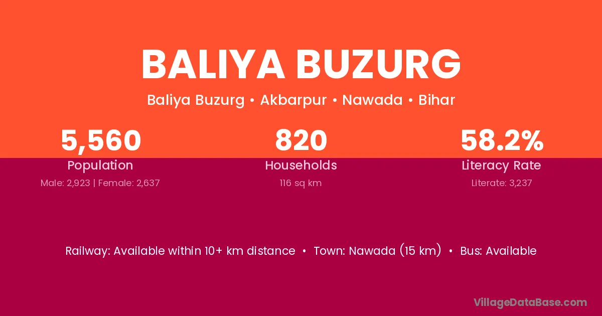 Nawada (15 km) is the nearest town to Baliya Buzurg village for major economic activities and is located approximately 15 km away.