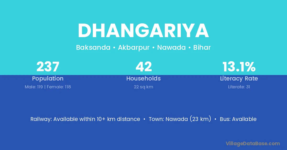 Nawada (23 km) is the nearest town to Dhangariya village for major economic activities and is located approximately 23 km away.