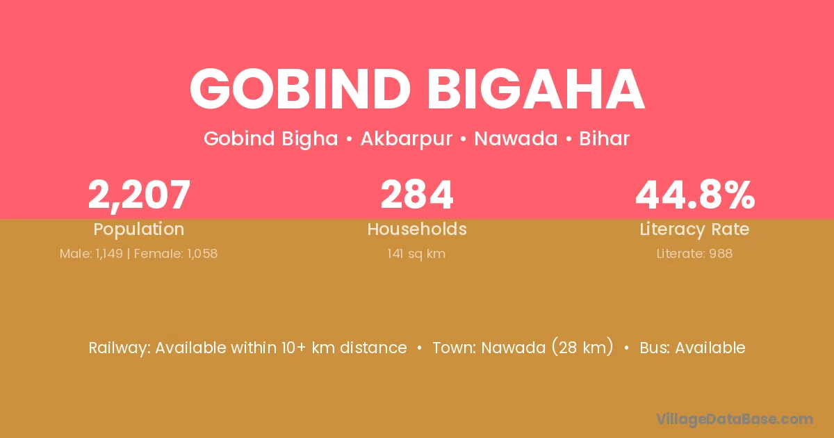 Nawada (28 km) is the nearest town to Gobind Bigaha village for major economic activities and is located approximately 28 km away.