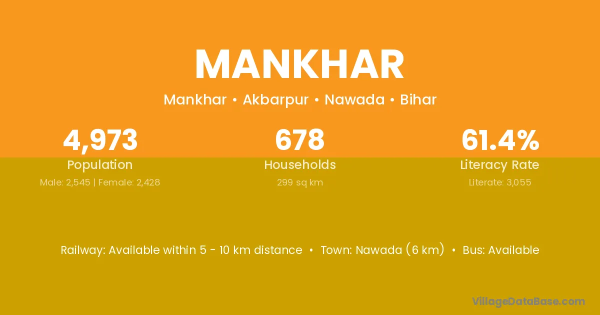 Nawada (6 km) is the nearest town to Mankhar village for major economic activities and is located approximately 6 km away.