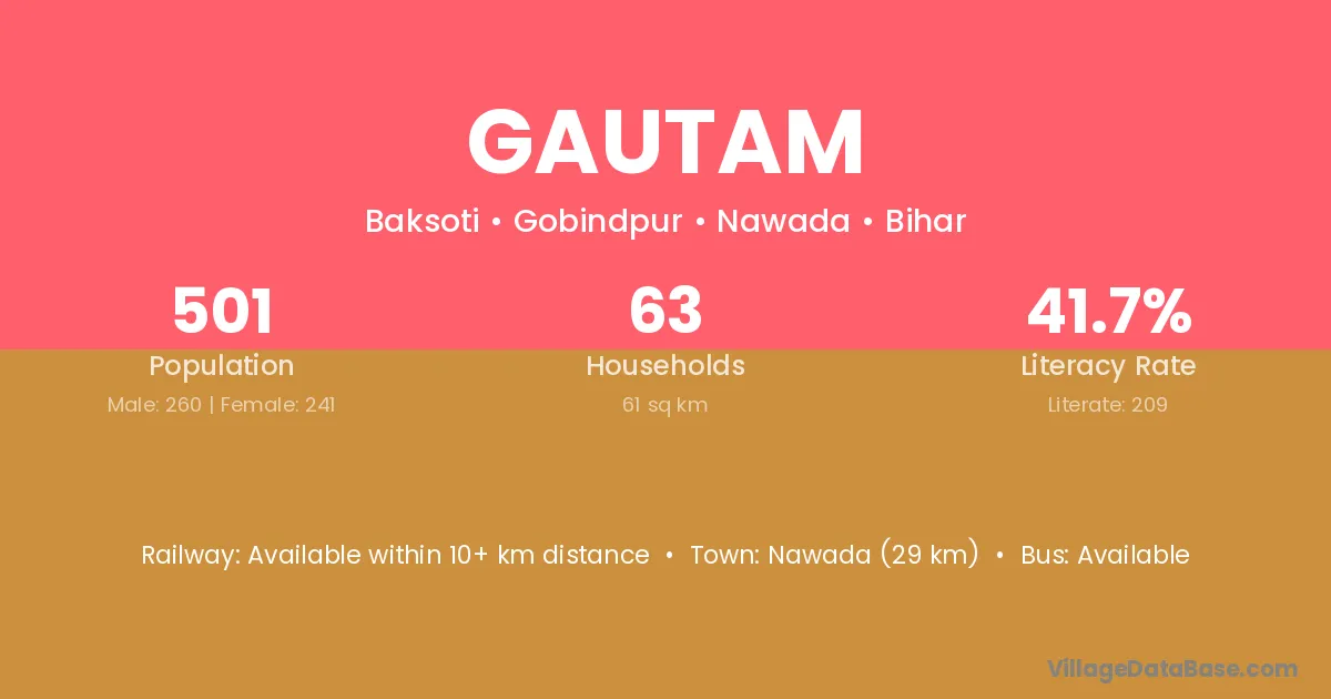 Nawada (29 km) is the nearest town to Gautam village for major economic activities and is located approximately 29 km away.