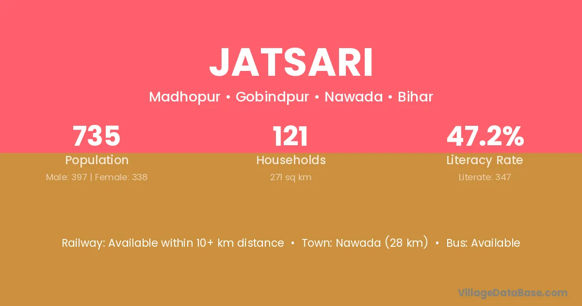 Nawada (28 km) is the nearest town to Jatsari village for major economic activities and is located approximately 28 km away.