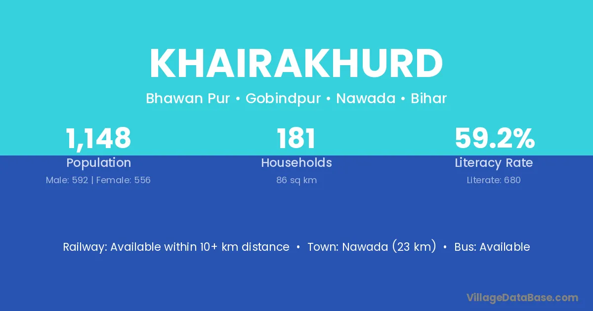 Nawada (23 km) is the nearest town to Khairakhurd village for major economic activities and is located approximately 23 km away.