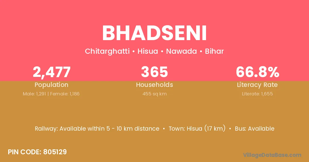 Hisua (17 km) is the nearest town to Bhadseni village for major economic activities and is located approximately 17 km away.