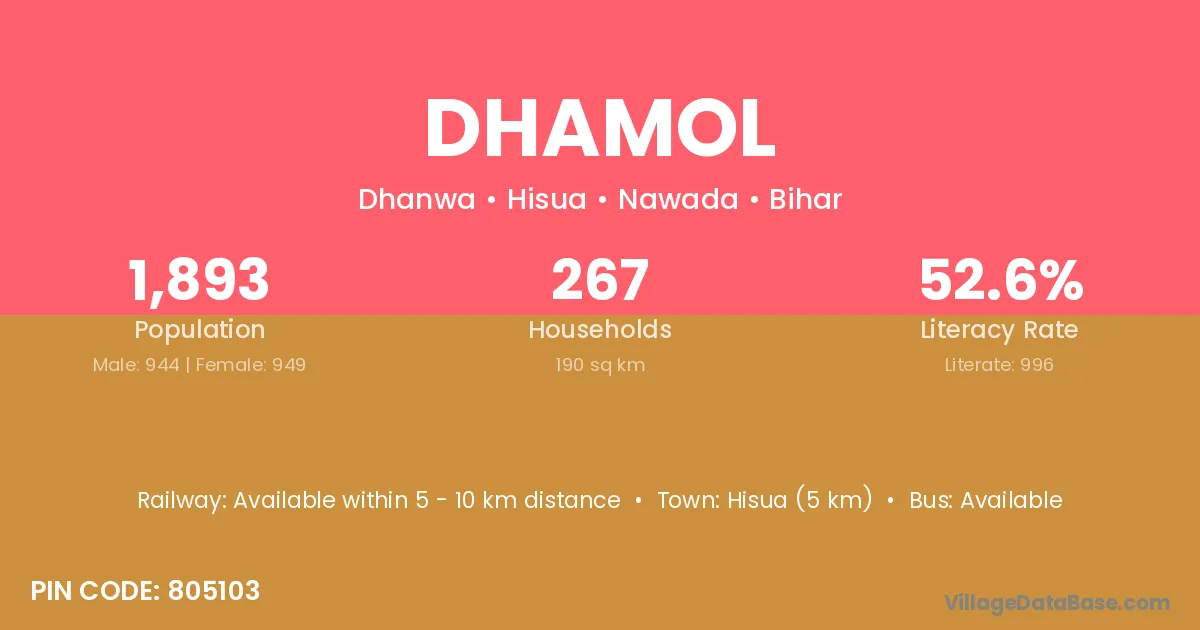 Hisua (5 km) is the nearest town to Dhamol village for major economic activities and is located approximately 5 km away.