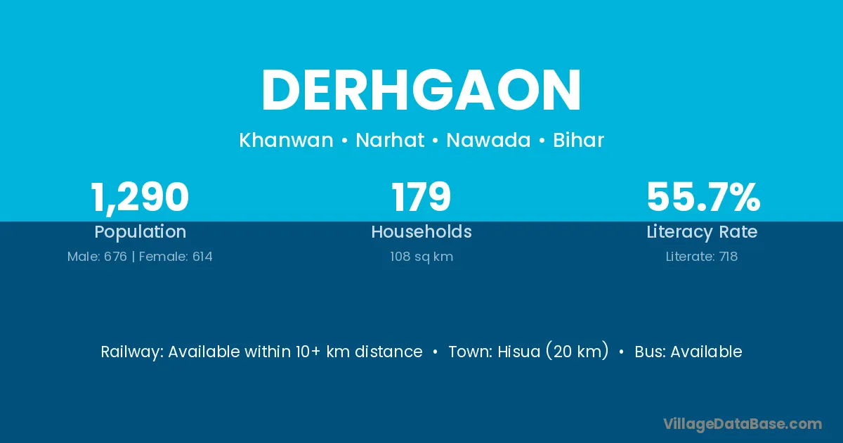 Warisaliganj (15 km) is the nearest town to Derhgaon village for major economic activities and is located approximately 15 km away.