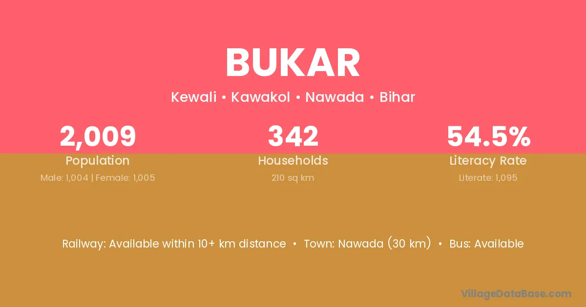 Nawada (30 km) is the nearest town to Bukar village for major economic activities and is located approximately 30 km away.