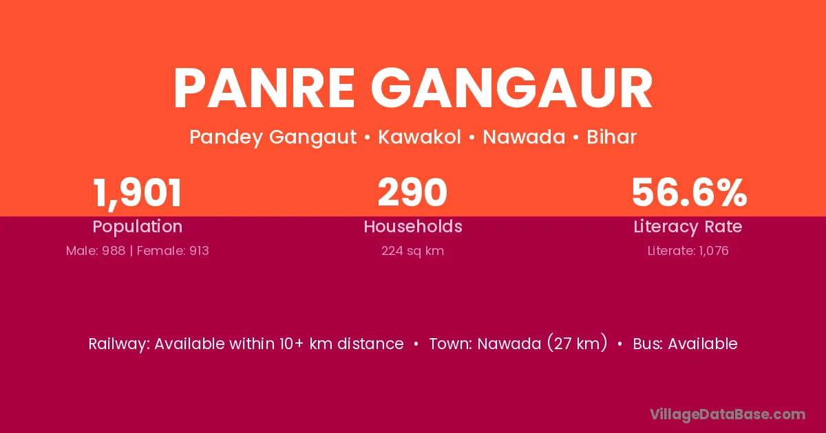Nawada (27 km) is the nearest town to Panre Gangaur village for major economic activities and is located approximately 27 km away.