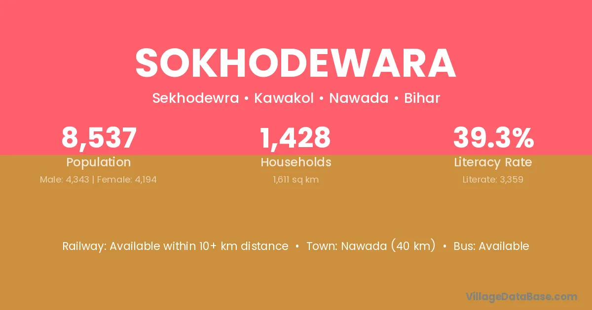 Nawada (40 km) is the nearest town to Sokhodewara village for major economic activities and is located approximately 40 km away.