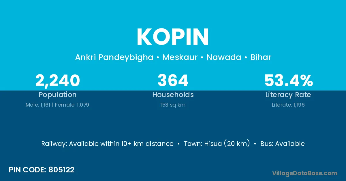 Hisua (20 km) is the nearest town to Kopin village for major economic activities and is located approximately 20 km away.