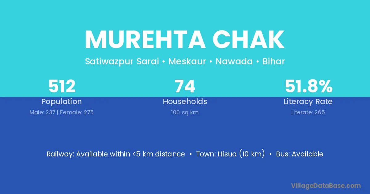 Murehta Chak village has a total population of 512 people, of which 237 are males and 275 are females.