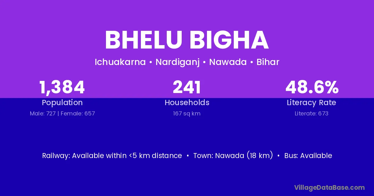 Nawada (18 km) is the nearest town to Bhelu Bigha village for major economic activities and is located approximately 18 km away.