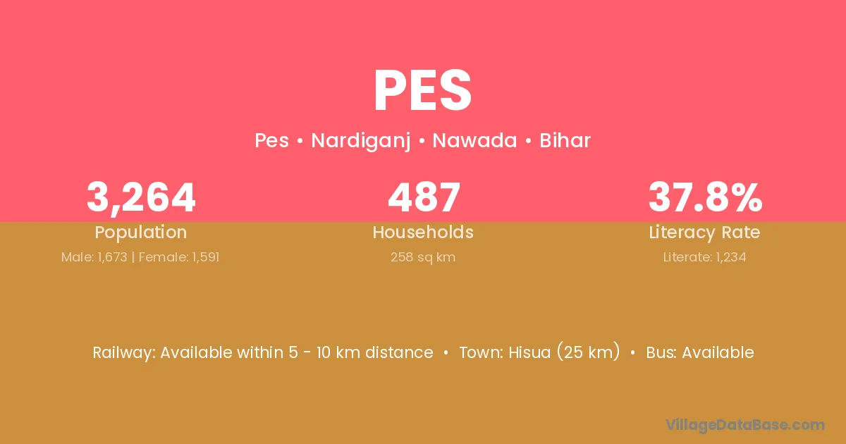 Hisua (25 km) is the nearest town to Pes village for major economic activities and is located approximately 25 km away.