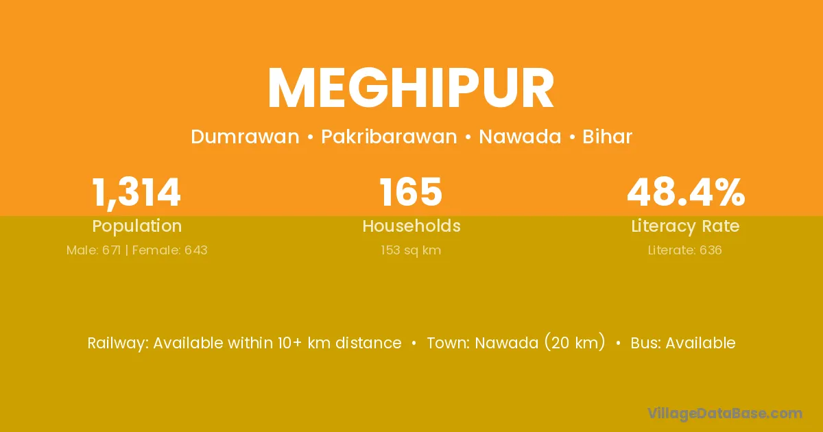 Nawada (20 km) is the nearest town to Meghipur village for major economic activities and is located approximately 20 km away.