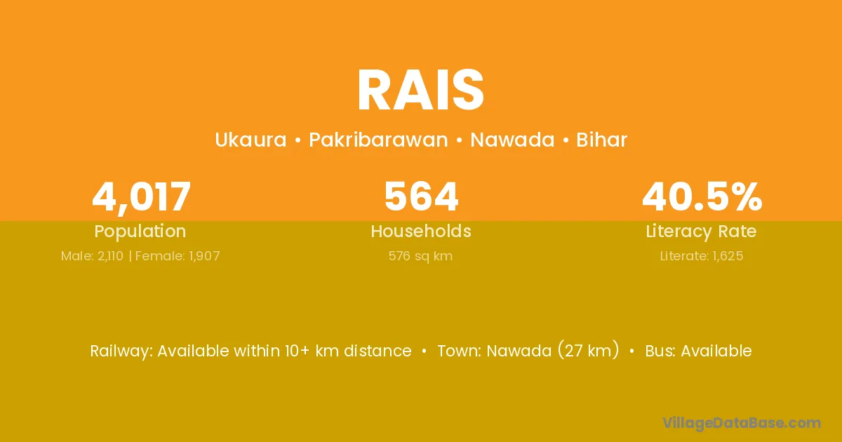 Nawada (27 km) is the nearest town to Rais village for major economic activities and is located approximately 27 km away.