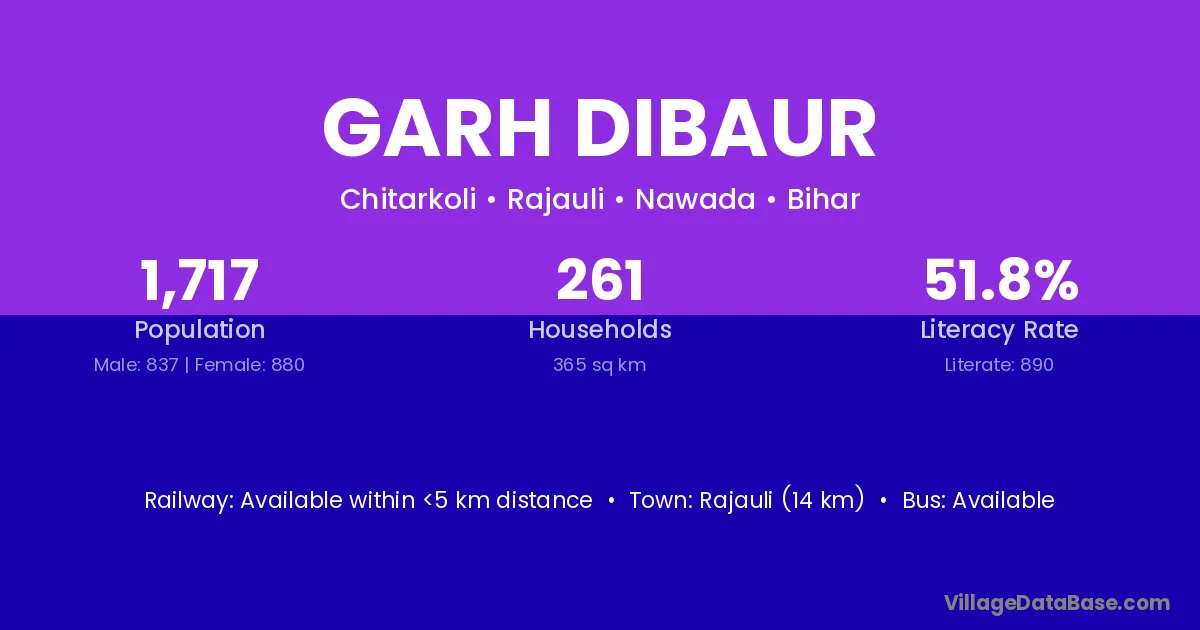 Rajauli (14 km) is the nearest town to Garh Dibaur village for major economic activities and is located approximately 14 km away.