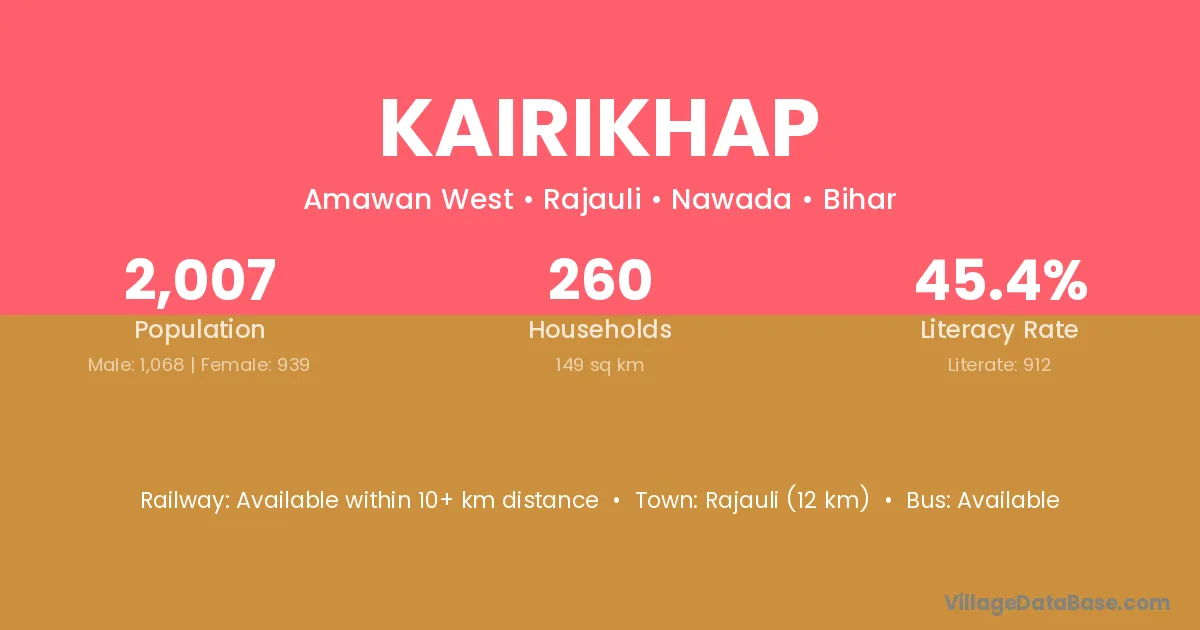 Kairikhap village has a total population of 2,007 people, of which 1,068 are males and 939 are females.