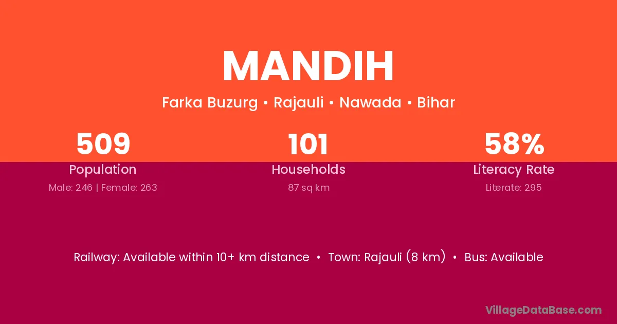 Rajauli (8 km) is the nearest town to Mandih village for major economic activities and is located approximately 8 km away.