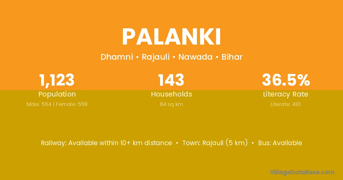 Rajauli (5 km) is the nearest town to Palanki village for major economic activities and is located approximately 5 km away.