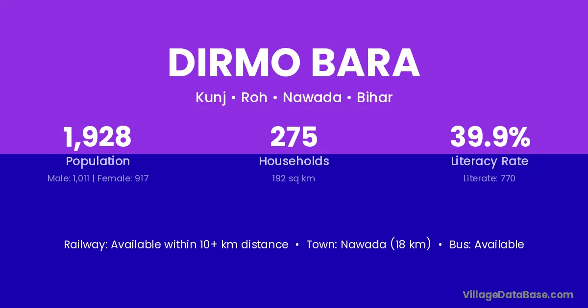Nawada (18 km) is the nearest town to Dirmo Bara village for major economic activities and is located approximately 18 km away.