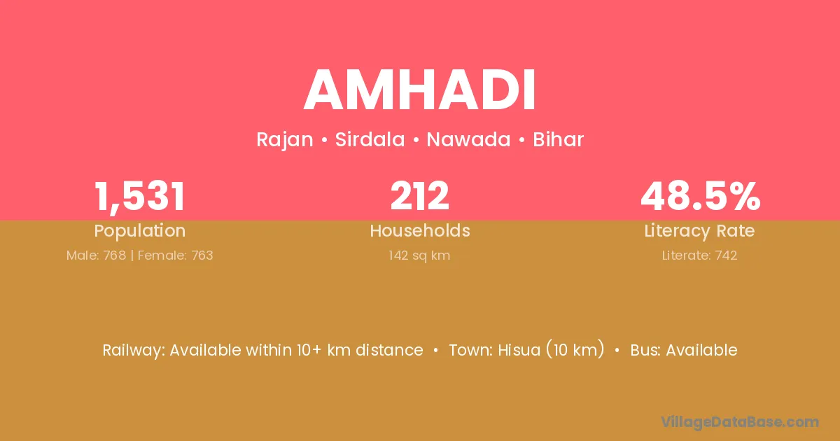 Hisua (10 km) is the nearest town to Amhadi village for major economic activities and is located approximately 10 km away.
