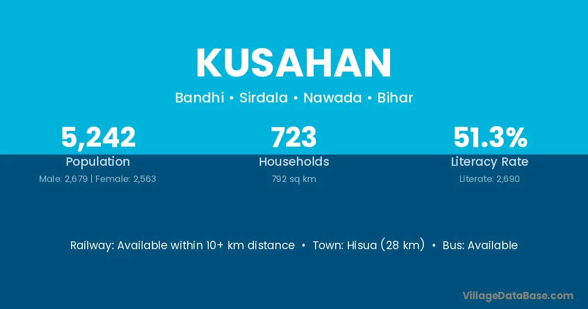 Kusahan village has a total population of 5,242 people, of which 2,679 are males and 2,563 are females.