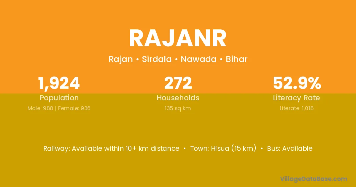 Hisua (15 km) is the nearest town to Rajanr village for major economic activities and is located approximately 15 km away.