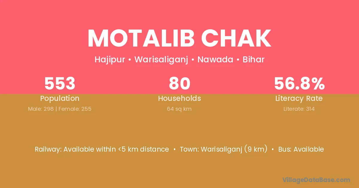 Warisaliganj (9 km) is the nearest town to Motalib Chak village for major economic activities and is located approximately 9 km away.