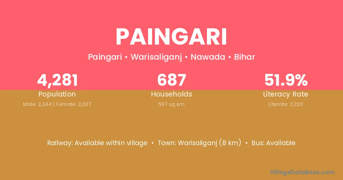 Warisaliganj (8 km) is the nearest town to Paingari village for major economic activities and is located approximately 8 km away.