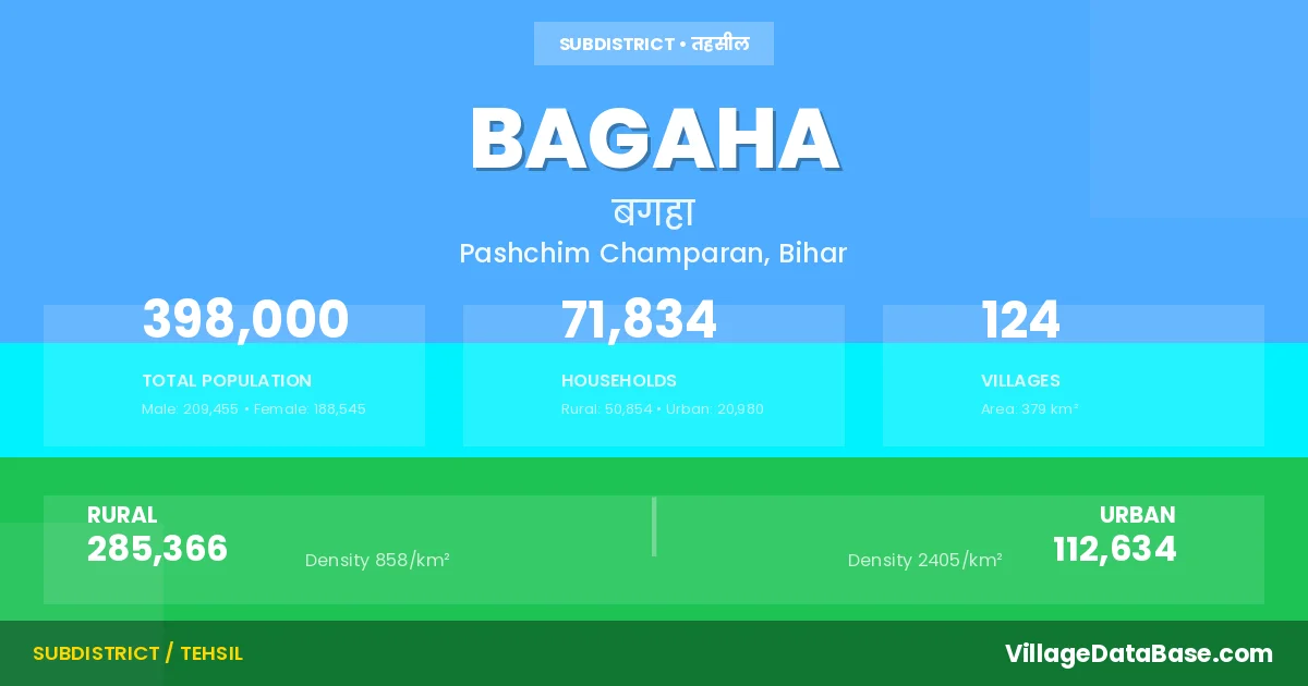 According to the 2011 census The total area of Bagaha Subdivision is 379 km², with a population of 398000 people. The population density is 1,049 inhabitants per square kilometre, and there are approximately 71834 houses in the sub district.