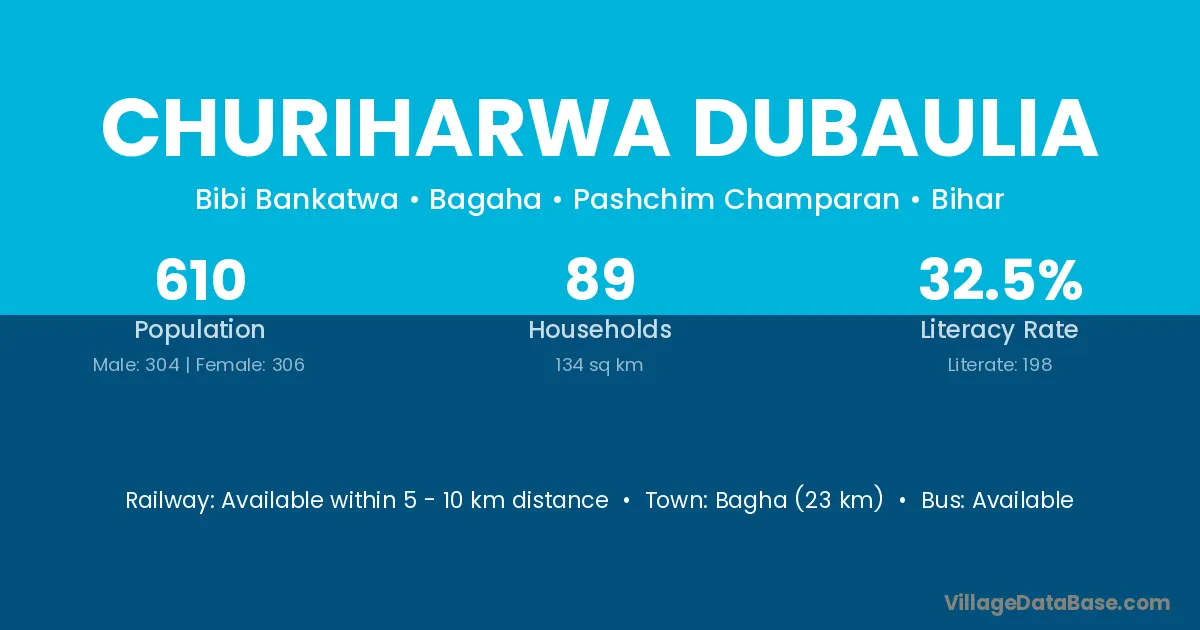Churiharwa Dubaulia village has a total population of 610 people, of which 304 are males and 306 are females.
