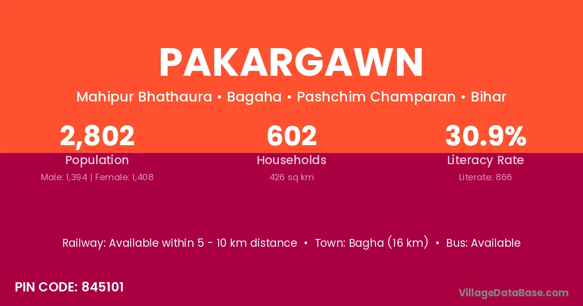 Bagha (16 km) is the nearest town to Pakargawn village for major economic activities and is located approximately 16 km away.